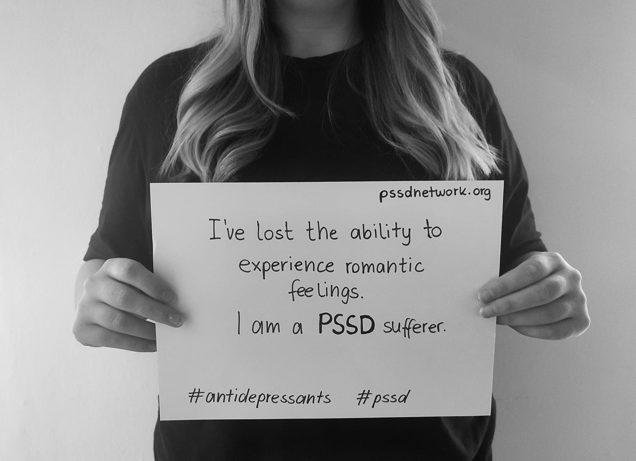 En pequeño en la esquina inferior izquierda el siguiente texto: #antidepressants #pssd